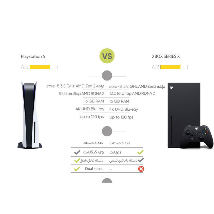 مدت زیادی بود که نام PS4 سر زبانها میچرخید و همهی توجهها به آن جلب شده بود؛ اما معرفی پلی استیشن نسل 5 مثل بمب صدا کرد و این کنسول بازی خانگی جای خودش را میان گیمرها باز کرد. PS5 نوع دیگری از کنسولهای بازی است که نسبت به PS4 تغییرات زیادی داشته است. اول اینکه PS5 از پردازنده AMD Ryzen Zen 2 با هشت هسته بهره میبرد. این کنسول به کارت گرافیک AMD RDNA 2 مجهز شده که از تکنولوژی Ray Tracing هم پشتیبانی کرده و توانایی اجرای بازیها با کیفیت 4K را داراست. اگر قصد خرید ps5 از دیجی کالا را دارید، با ما همراه باشید تا با قابلیتهای این محصول بیشتر آشنا شوید. مشخصات ظاهری کنسول بازی سونی مدل Playstation 5 کنسول بازی سونی مدل Play station 5 Digital با ابعاد 260*92*390 میلیمتر و وزن 2 کیلوگرم، به شکل بسیار زیبا و متقارن طراحی شده است. البته نسبت به نسخه قبلی این ابعاد کمی بزرگتر بوده که احتمالاً به خاطر سیستم خنککننده این کنسول باشد. خنککننده پلی استیشن 5، یکی از نقاط قوت این محصول است که علاوه بر قدرت بالا در خنککنندگی، سر و صدای کمی هم ایجاد میکند. بدنه این محصول از دو رنگ سفید و مشکی تشکیل شده که روی بدنه سفید رنگ این کنسول طرحهای بسیار ریز چهار نماد اصلی این شرکت یعنی ضربدر، مثلث، مربع و دایره وجود دارد. حس فوقالعاده بازی با دسته DualSense دسته بازی DualSense که بهصورت اختصاصی برای کنسول بازی سونی5 طراحی شده است، ویژگیهای منحصربهفردی دارد. دسته DualSense قادر است احساسات مختلفی را در هنگام بازی به شما منتقل کند. به عبارت دقیقتر، احساس لمس یا تفاوت در سطوح مختلف از طریق دسته به شما منتقل شده و تجربه لذت بخشی را برایتان فراهم میکند. در ضمن این دسته دارای اسپیکر داخلی است که صداهای خاصی را در هنگام بازی انتقال میدهد و میتواند تجربه صوتی در هنگام بازی را هم بهبود ببخشد. روی این دسته یک نوار نوری قرار دارد که با تغییر وضعیت بازی تغییر میکند و اطلاعاتی مانند وضعیت شارژ دسته و یا وضعیت بازیکن را نمایش میدهد. سختافزار قدرتمند شرکت سونی در این پلیاستیشن خود از پردازنده AMD Ryzen Zen در کنار AMD Radeon RDNA 2 به عنوان پردازنده گرافیکی و 825 گیگابایت حافظه داخلی استفاده کرده تا این محصول پرچمدار محصولات این شرکت باشد. البته با تمام این تلاشها، این محصول هنوز کمی با رقیب بزرگش یعنی کنسول XBOX series X فاصله دارد. اما این فاصله چیزی از تواناییهای این کنسول برای اجرای بازیهای مختلف کم نمیکند. علاوه بر این وجود تکنولوژی Ray Tracing در این کنسول بسیار جذاب است. ری تریسینگ نوعی فناوری گرافیکی است که با ایجاد نورپردازی و سایهدهی واقعگرایانهتر، تصاویر را با کیفیت بالاتر به ما نشان داده میدهد. در حین استفاده از Ray Tracing در بازیها، نور به صورت واقعی از اشیاء منعکس و شکسته شده و این تغییرات نوری باعث ایجاد تصاویر با جزئیات بالاتر و واقعگرایانهتر میشود. ایجاد این حس فوقالعاده، مدیون توانمندی گرافیکی پردازنده گرافیکی این کنسول است. ناگفته نماند که درایو بازی این محصول همچنان Ultra HD Blu-ray, up to 100GB/disc است. پلیاستیشن 5 بهواسطه مجهز بودن پورت LAN یا اتصال بیسیم Wi-Fi به راحتی به اینترنت متصل شده و امکان دانلود بازیهای جدید را هم فراهم میکند. در نهایت میتوان گفت پلیاستیشن ۵ با ظرفیت 825 گیگابایت با قابلیتهای بهبود یافته نسبت به نسل قبلی خود، یکی از بهترین گزینهها برای علاقهمندان به بازیهای ویدئویی با کیفیت بالاست.
